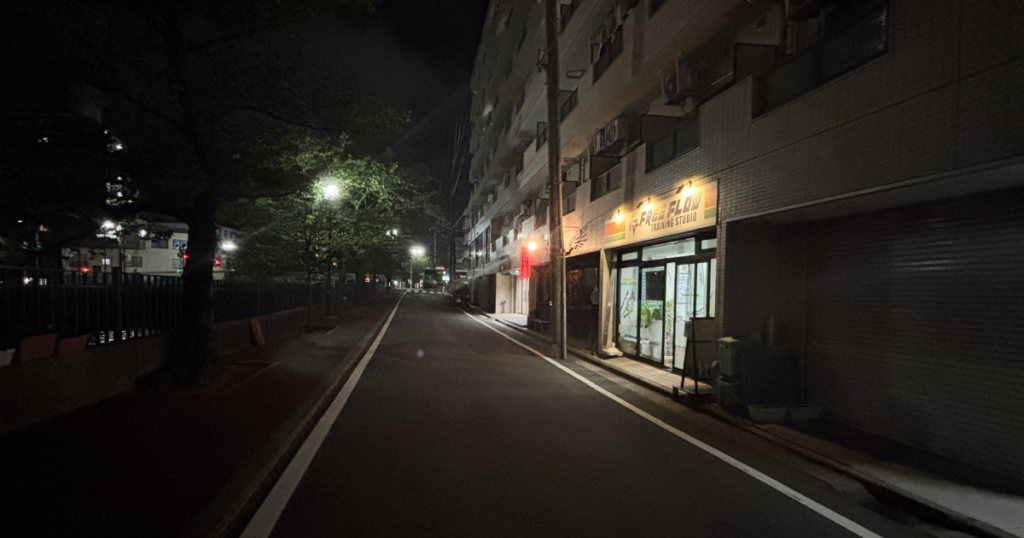 FREE FLOWがある通りは川沿いで周囲もやや暗く、